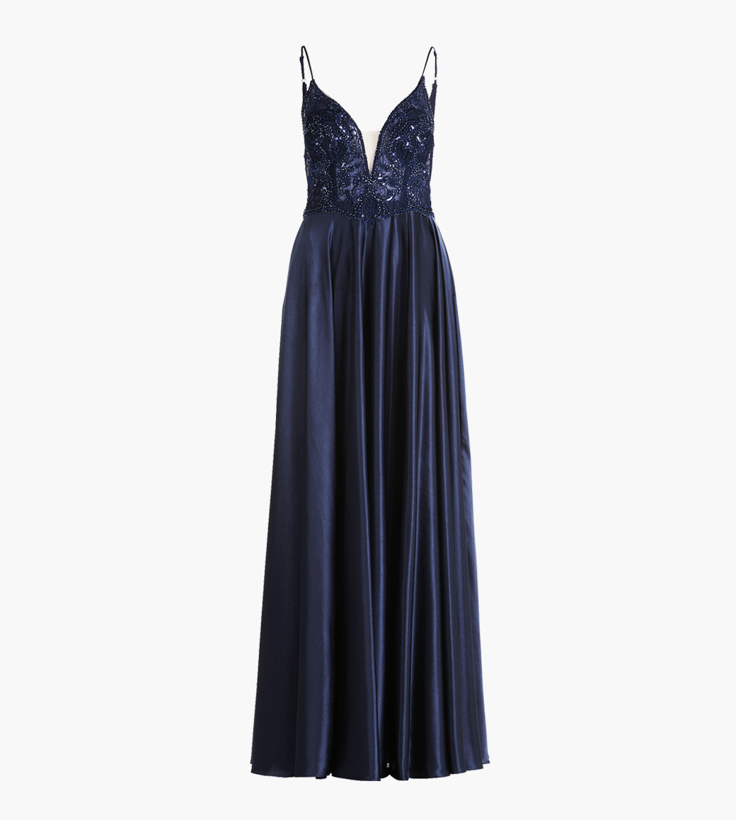 Wunderschönes Abendkleid in A-Linie und tiefem V-Ausschnitt. Dekolleté teilweise mit Tüll gefüttert